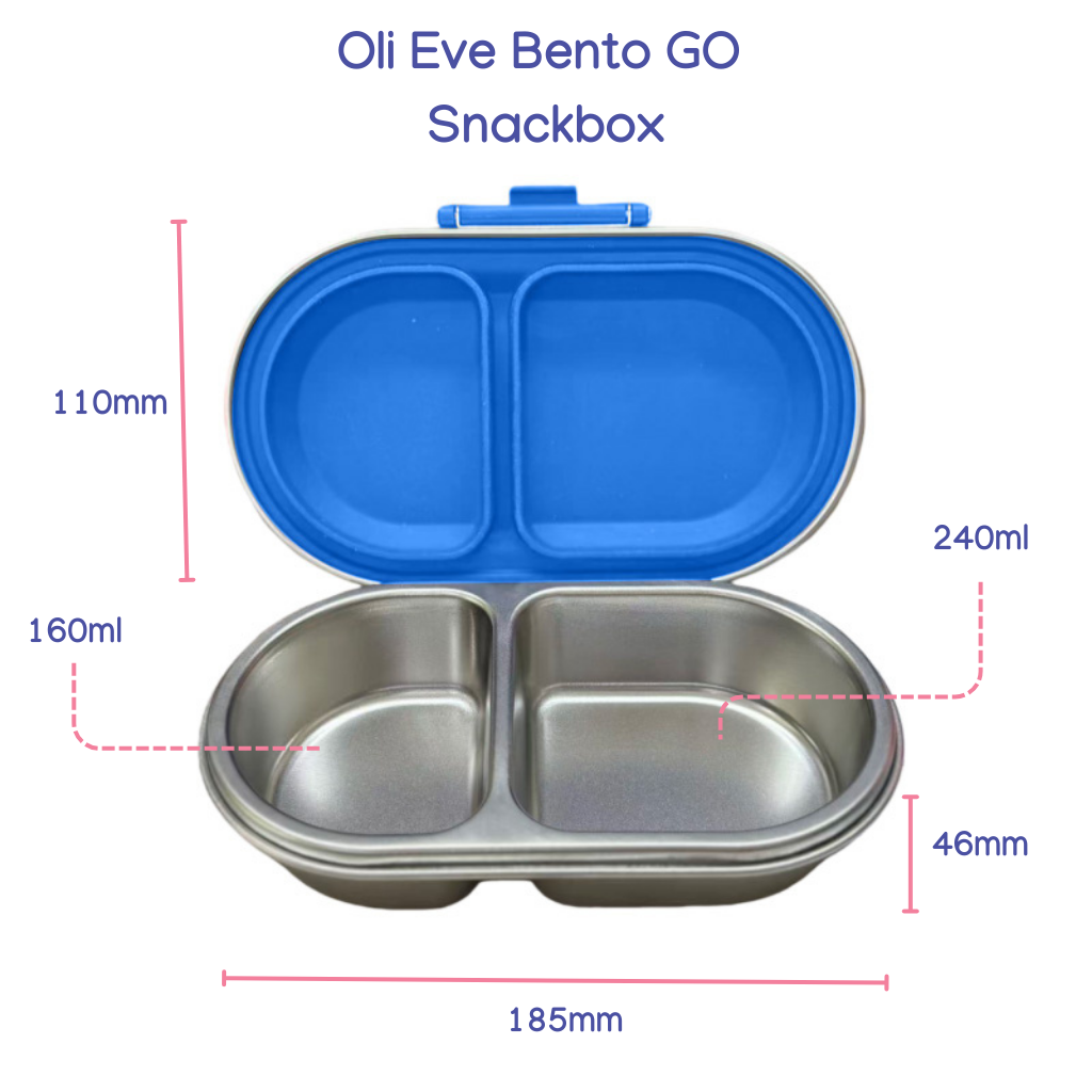The Oli Eve Bento Go is a premium 2-compartment stainless steel snack box designed for Crunch & Sip, brain breaks, playground fuel stops and snacks on the go. Its the perfect companion to the Oli Eve Bento 4 or Bento 5 to round off your stainless steel school lunchware.